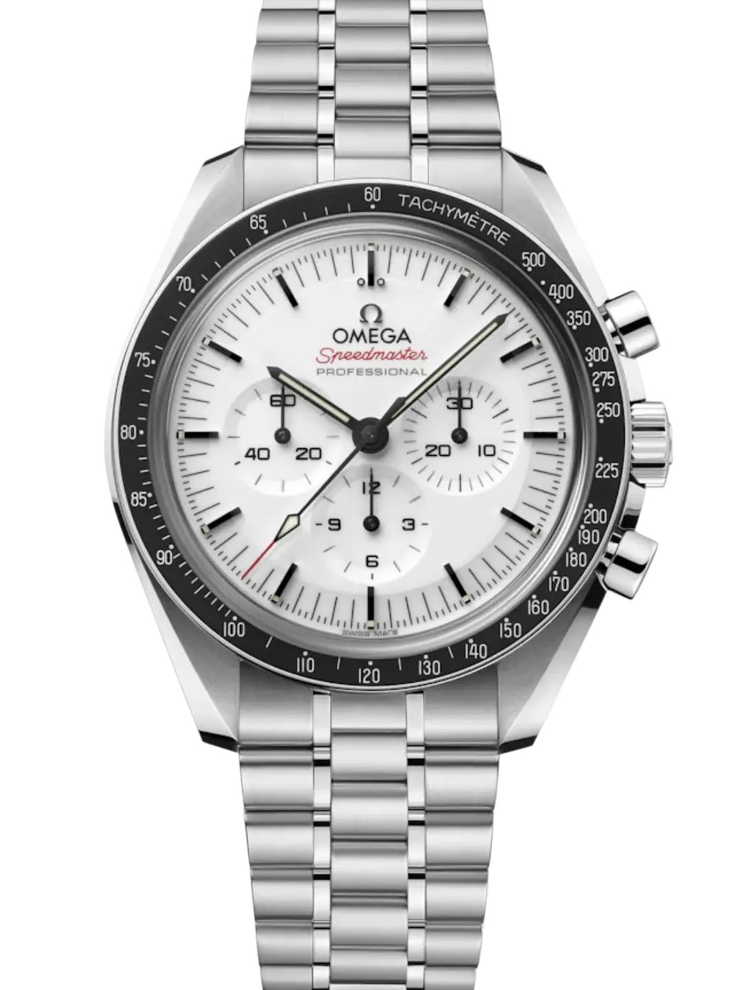 White lacquered step dial, with blackened/luminous hands & indexes, red “Speedmaster” script